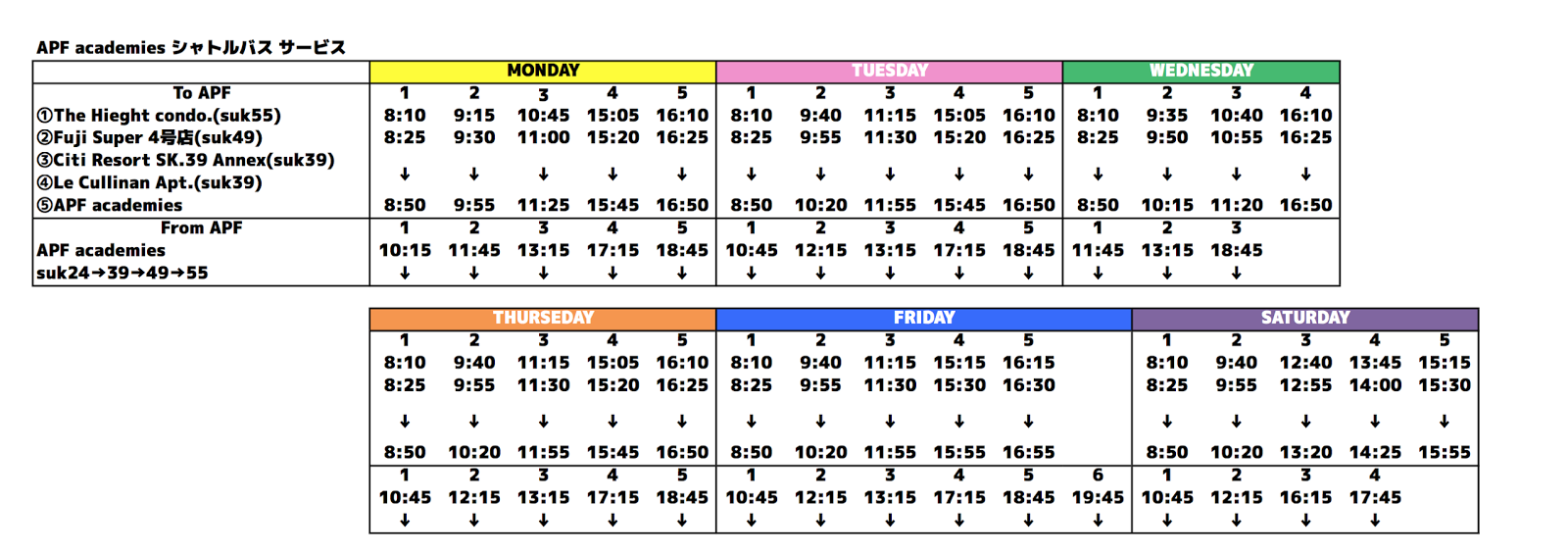 送迎バスのルートはスクンビット55,49,39,26を通りAPFに到着します。