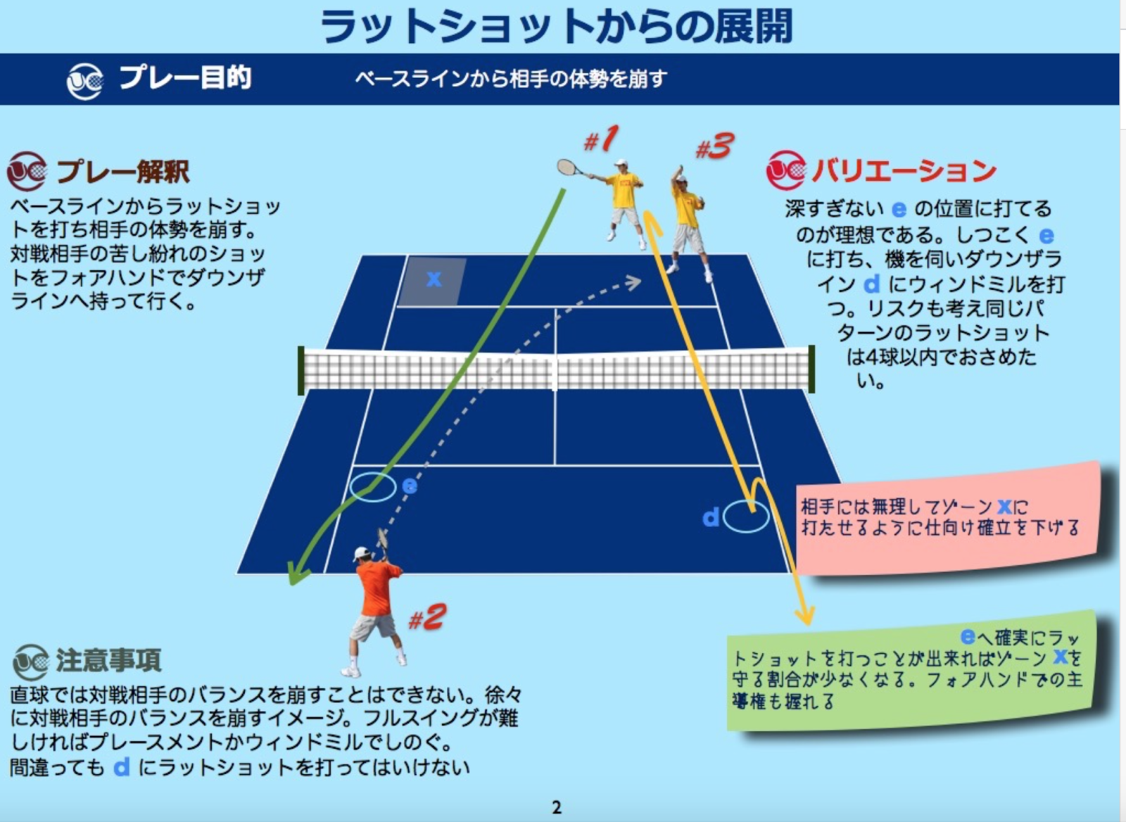 もちろん説明の際には映像も使用します。この戦術を学んだ後にテニスの試合をみるとまた違った角度からテニスを見ることができるかもしれません。 特にフレンチオープンでは単調な打ち合いではポイントが取れません。選手の様々な高さ、角度、球種を的確に選んでいることを見ながら観戦しましょう。 次回は6/21(日)を予定しております。是非ともご参加ください。