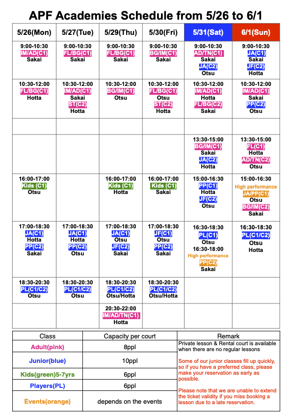 以下は、5月26日(月)から6月1日(日)のスケジュールです。