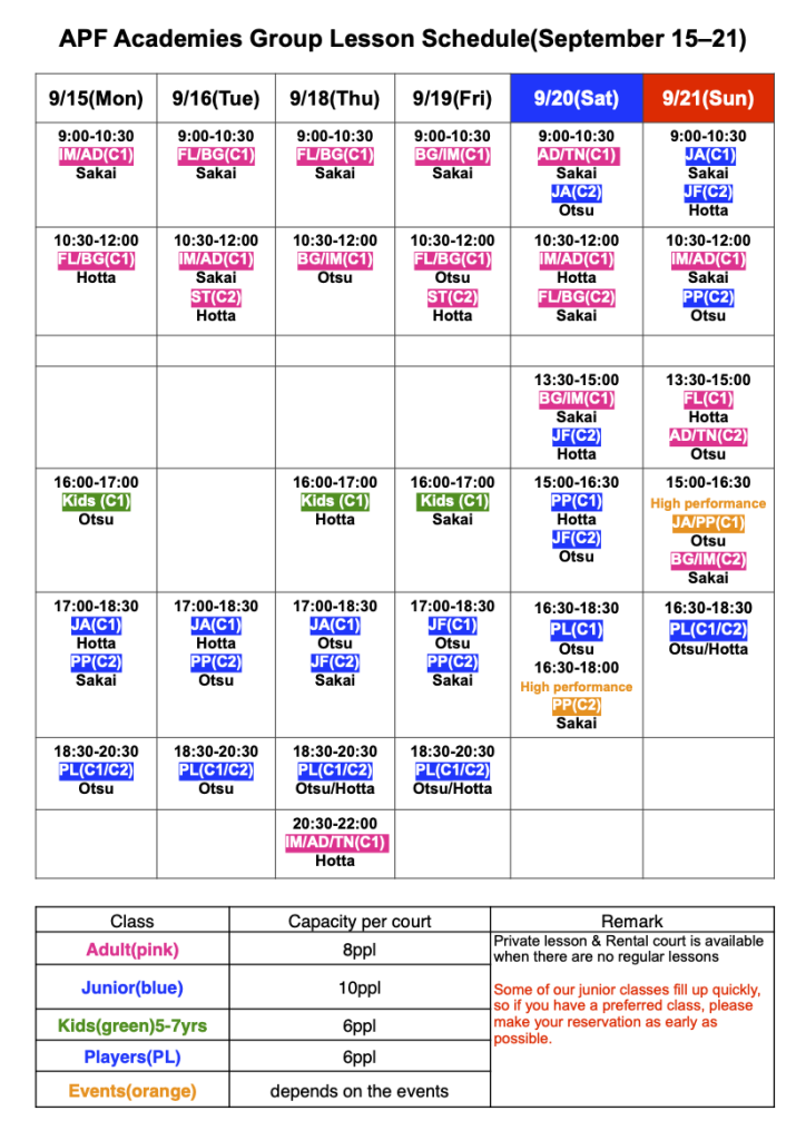 以下は、9月15日(月)から9月21日(日)のグループレッスンスケジュールです。