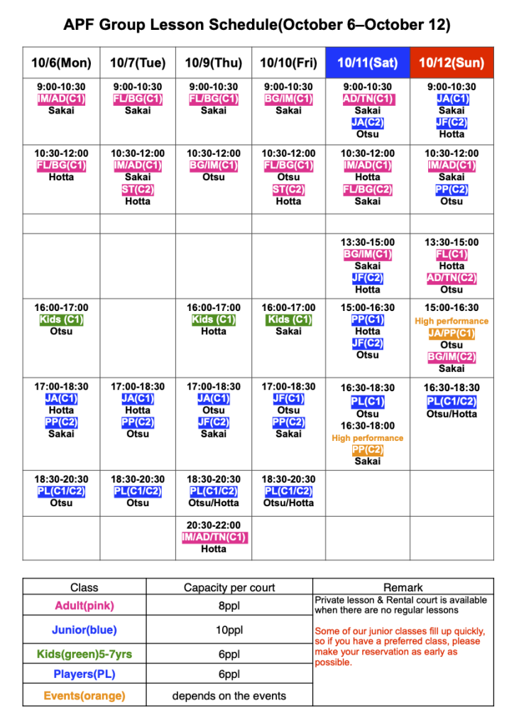 以下は、10月6日(月)から10月12日(日)のグループレッスンスケジュールです。