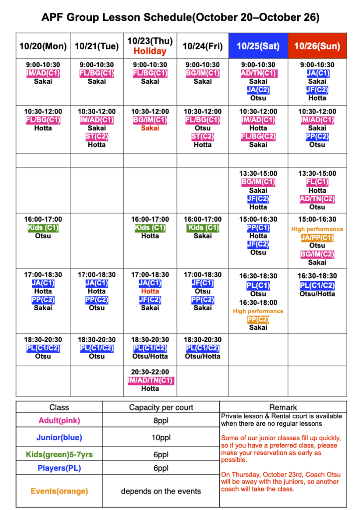 以下は、10月20日(月)から10月26日(日)のグループレッスンスケジュールです。