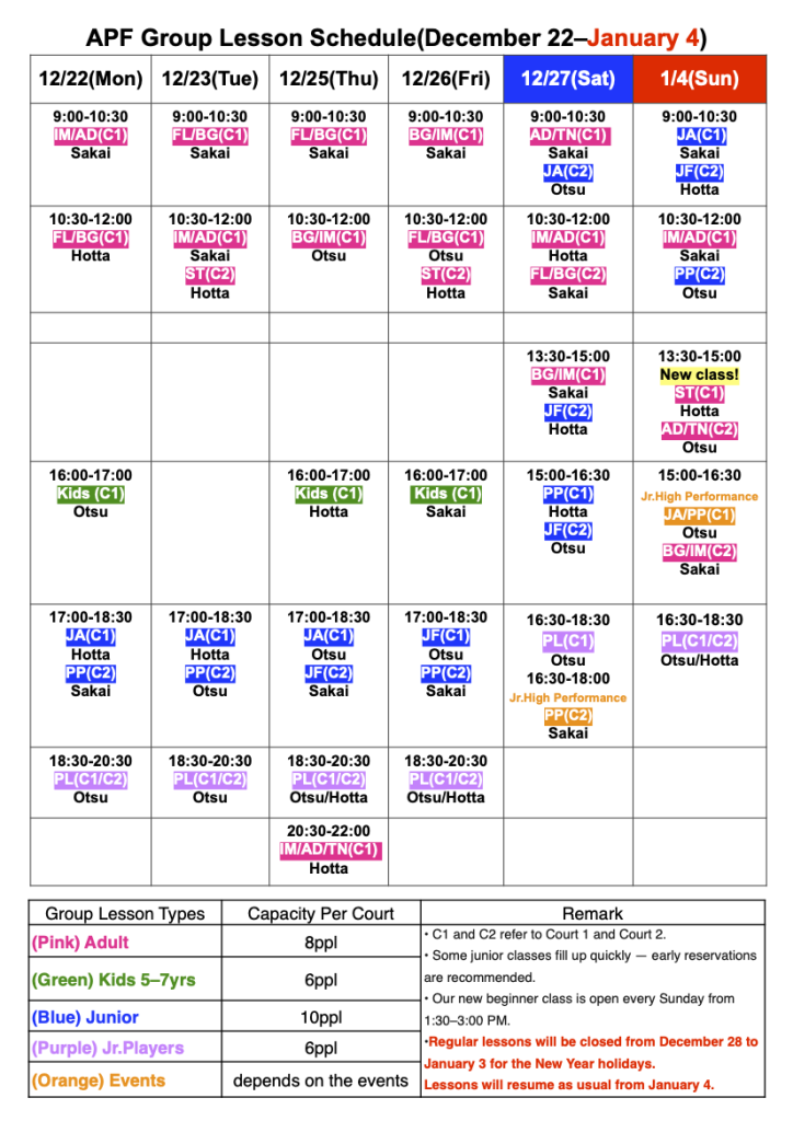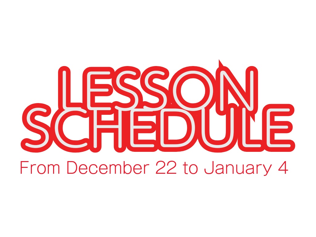 以下は、12月22日(月)から1月4日(日)のグループレッスンスケジュールです。