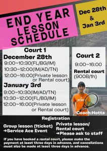 - 12/28(土),12/29(日)レッスン、レンタルコートあります! 2024年12月19日