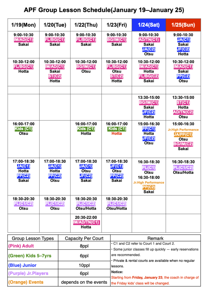 以下は、1月19日(月)から1月25日(日)のグループレッスンスケジュールです。