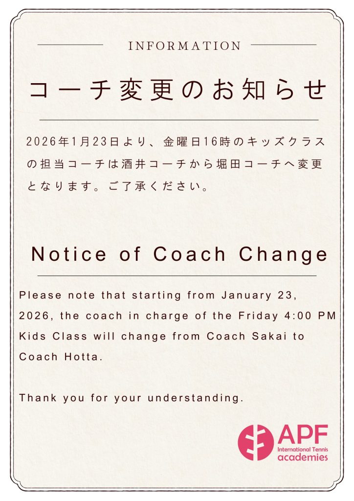 また、1月23日(金)より金曜日のキッズクラスの担当コーチが変更になります。