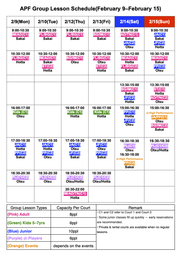 以下は、2月9日(月)から2月15日(日)のグループレッスンスケジュールです。