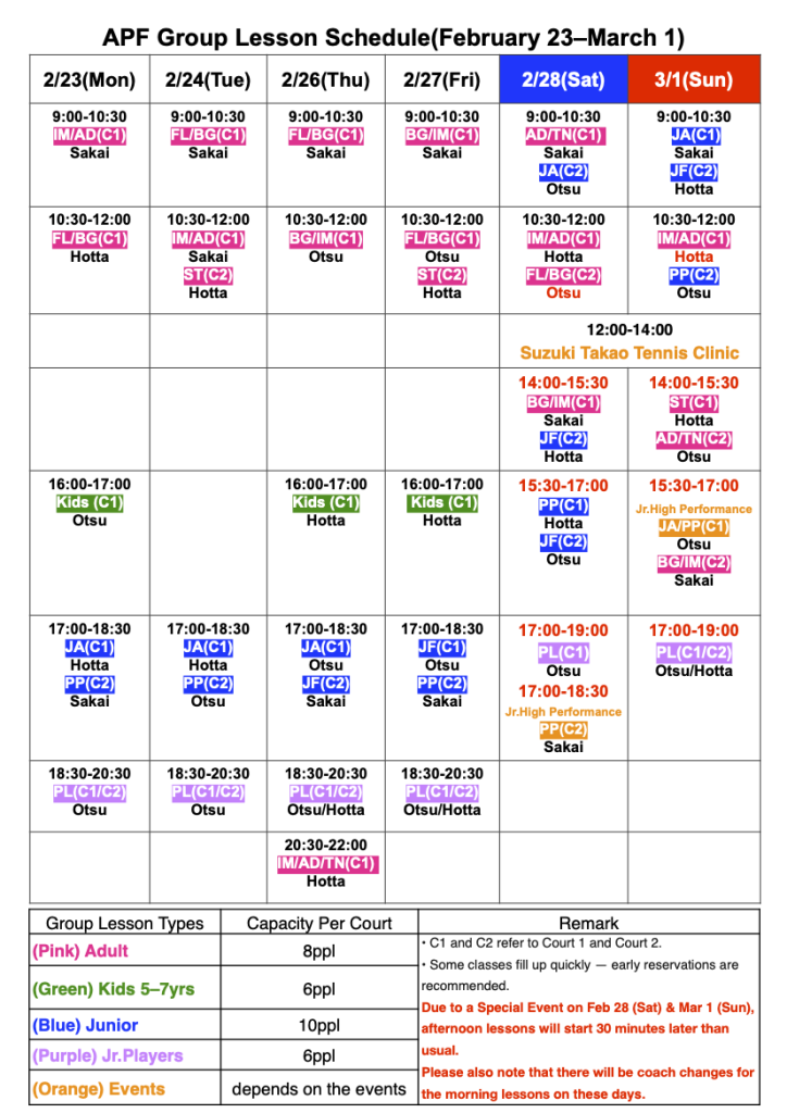 以下は、2月23日(月)から3月1日(日)のグループレッスンスケジュールです。