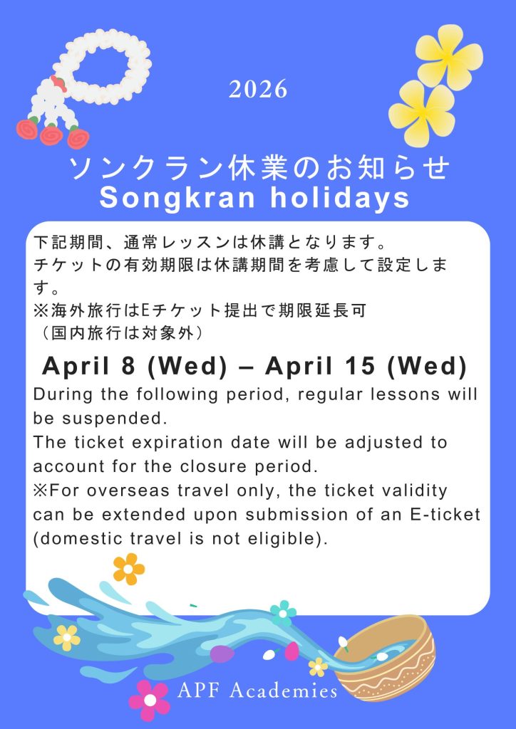 少し早いですが、APFのソンクラン休暇についてお知らせいたします。