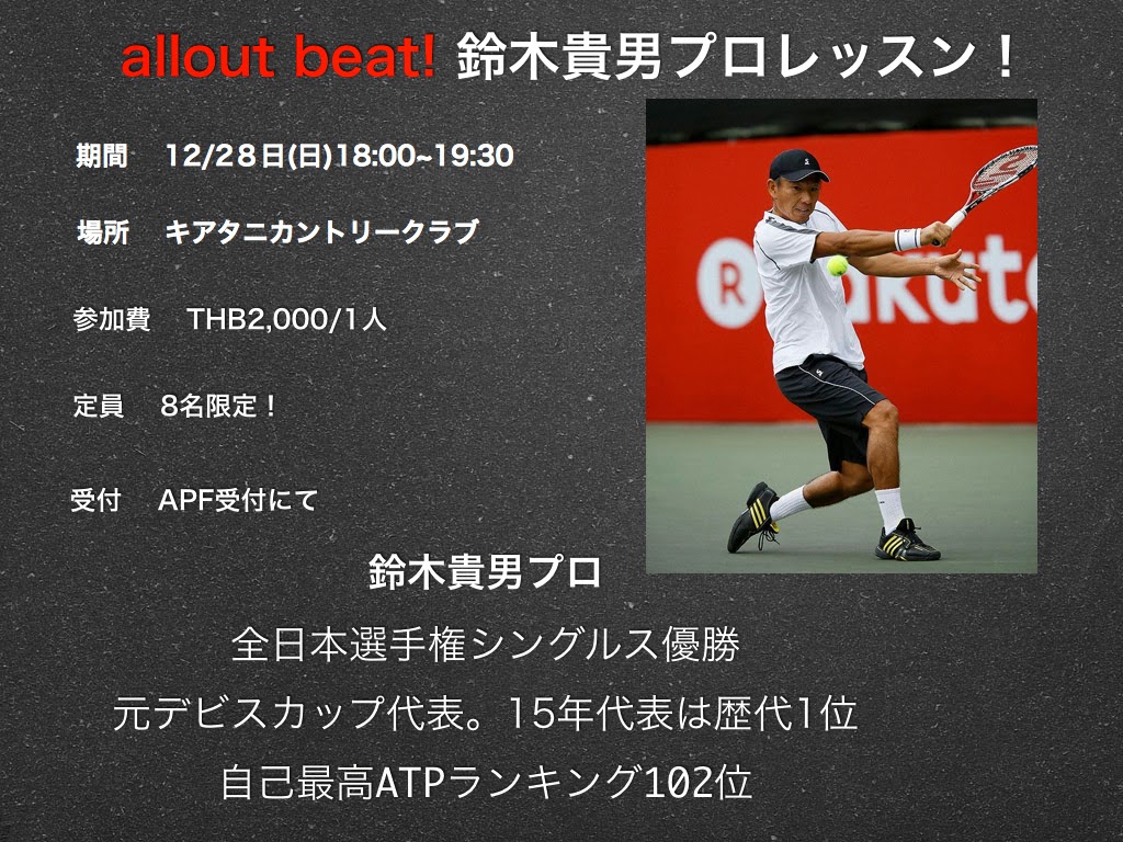 そして12/28(日)Mr『allout』鈴木貴男プロのレッスンも開催します。 鈴木貴男プロは、全日本選手権シングルス優勝。そして何よりデビスカップ代表年数15年と歴代1位です。ATP世界ランキングも最高102位。 今では数少ないネットプレーヤーです。今現在も現役選手として活躍している鈴木プロのサーブとボレー、スライスに挑戦してみて下さい。