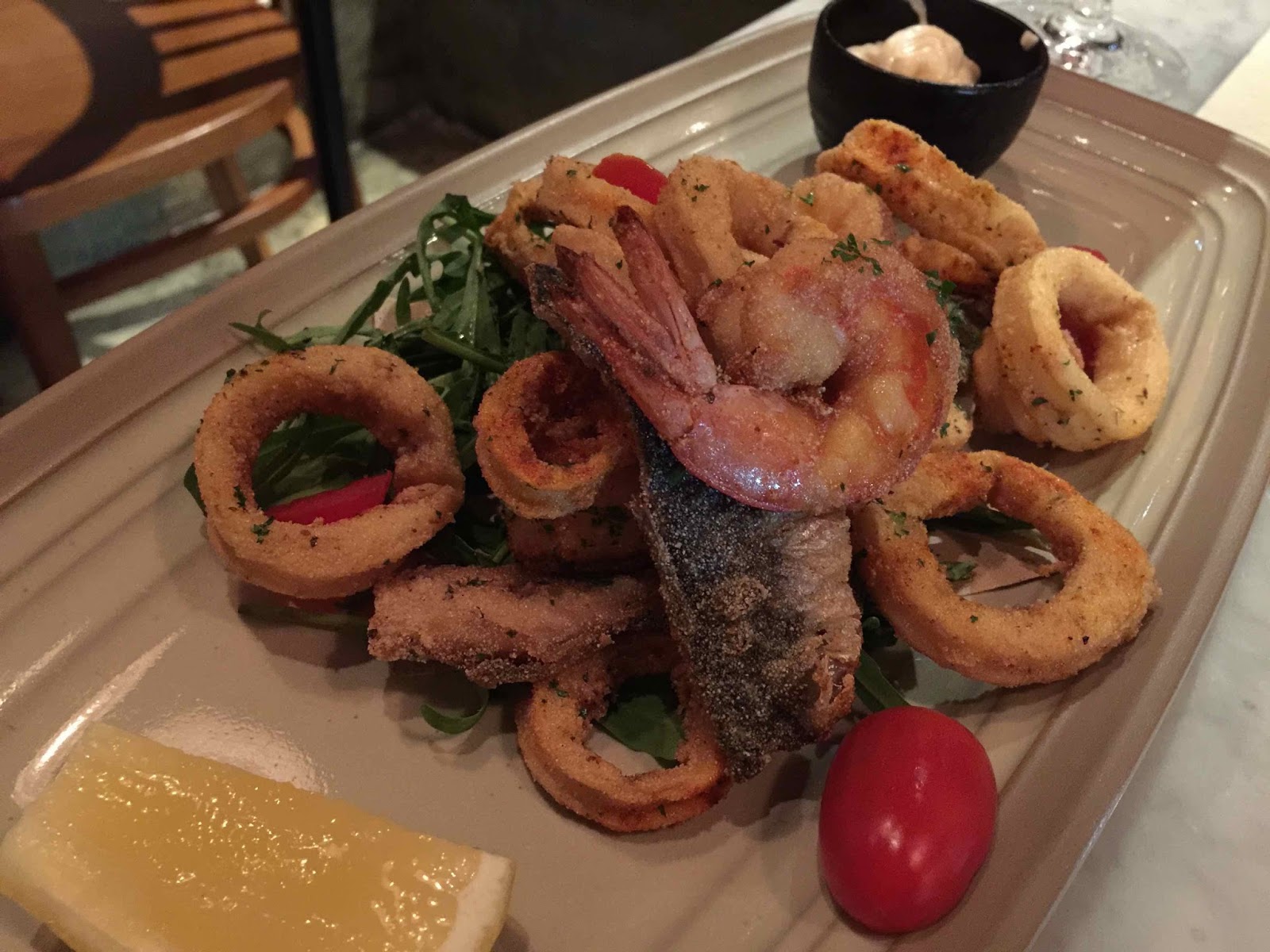 ほどよく揚げた、新鮮なエビ、イカ、イワシの上に、レモンを掛けて食べながら、美味しいビールをグイーっと。