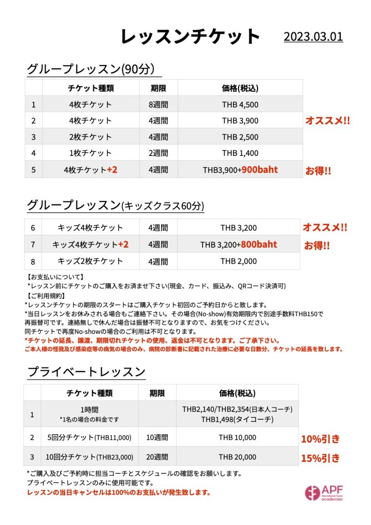 1.APF Academies受付又は振込にてご希望のレッスンチケットをご購入下さい。